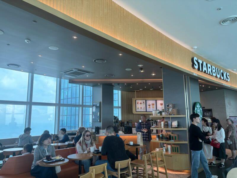 Además de las vistas, una parada obligatoria dentro del mirador es el Starbucks más alto de Corea del Sur. Disfrutar de un café con semejante panorámica es una experiencia única, y es perfecto para descansar mientras tomas fotografías impresionantes desde sus enormes ventanales.